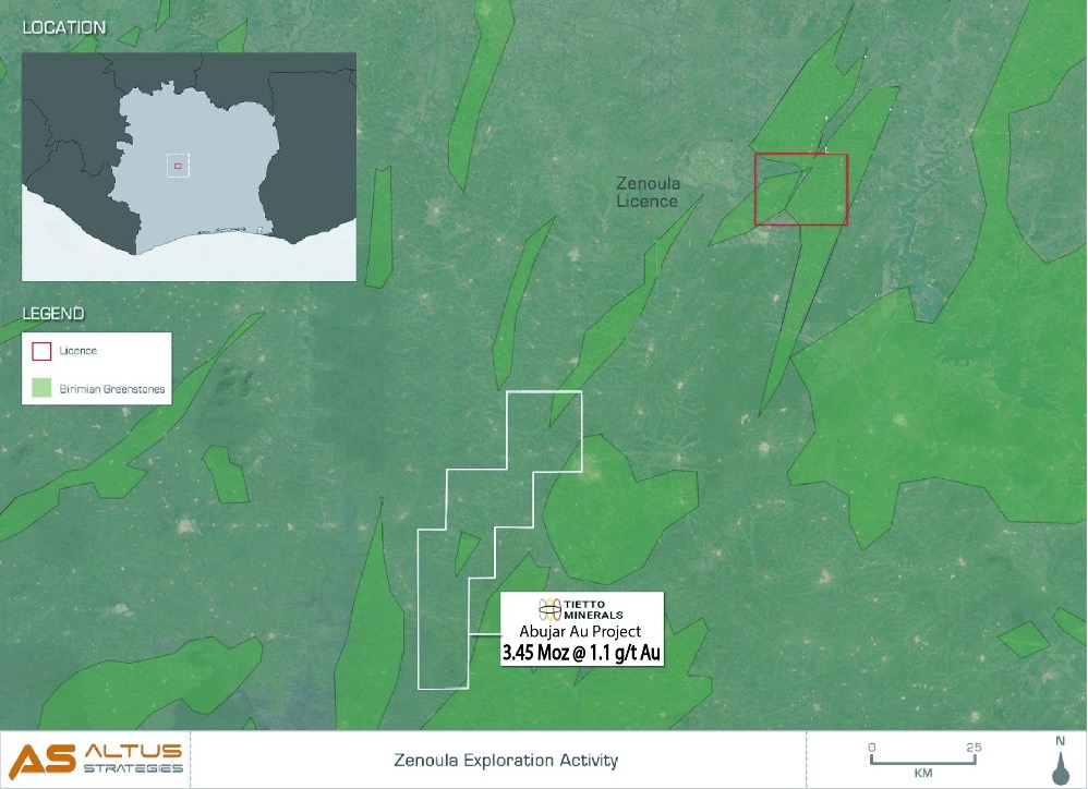 The Zuénoula Gold Licence comprises a single 400km2 permit application which is currently in process with final approval and licence issuance pending. The Zuénoula Gold Licence is in the Marahoue Department in central Côte d’Ivoire, approximately 300 km north of the capital city of Abidjan. The licence is located 100 km north of the town of Yamoussoukro and is accessible by asphalt roads from Abidjan. Zuénoula is centred within a NNE trending Birimian age granite greenstone belt. Zuénoula is located in a desirable gold region that has attracted a number of foreign corporations including ASX listed Tietto Minerals Limited with its new producer, the Abujar Gold Project (see map below). Also active in the region is Perseus Mining with its Yaouré Gold Mine, and Montage Gold with the Koné gold deposit.