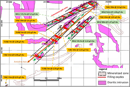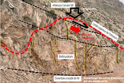 Following a detailed mapping and a structural survey initiated in December 2022, a technical report with a comprehensive interpretation of the geometry of the gold mineralisation at Tichka Est Structure B has been completed and submitted by an independent geologist. The interpretation of the extensional mineralized veins inside the Diorite Intrusion (see figure 1) recommends drilling parallel to the ENE-WSW Shear Zone rather than perpendicular to the Shear Zone. This direction, perpendicular to the opening zones of extensional veins, was not tested during the 2022 reconnaissance RC drilling program.